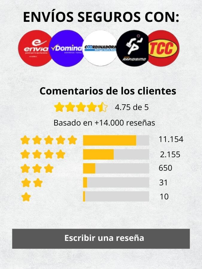 OTRAS CIUDADES:Esto puede variar según los transbordos que tenga que hacer la transportadora (puede ser más de 10 días). No hacemos envíos a veredas, la transportadora no nos presta ese servicio.
