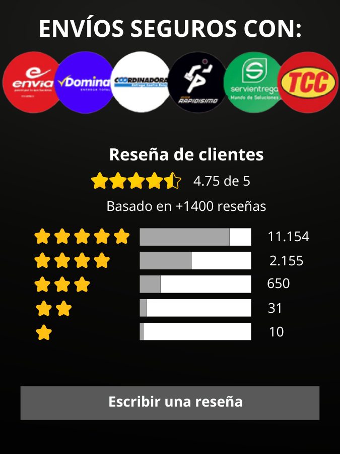 OTRAS CIUDADES:Esto puede variar según los transbordos que tenga que hacer la transportadora (puede ser más de 10 días). No hacemos envíos a veredas, la transportadora no nos presta ese servicio.